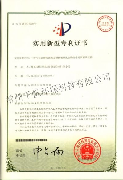 實用新型專利證書 一種用于污水生化處理的生物接觸氧化裝置