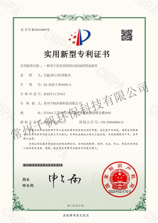 實用新型專利證書 一種用于矩形風管轉(zhuǎn)向的加固型連接件